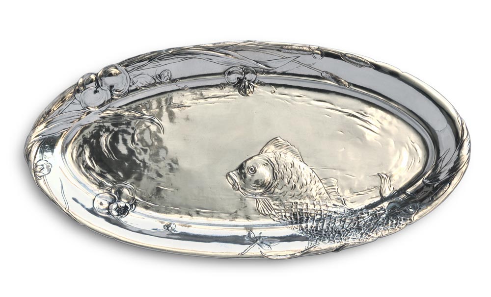 Die ovale Servierplatte „PESCO“ ist aus massivem Zinn gefertigt und detailreich mit einem Fischrelief gearbeitet. Mit 49,5 x 26 cm bietet sie großzügig Platz für ganze Fische, Meeresfrüchte oder stilvoll angerichtete Antipasti. Ihre klare Form, das Gewicht und die außergewöhnliche Gravur machen sie zu einem Blickfang auf jedem gedeckten Tisch.